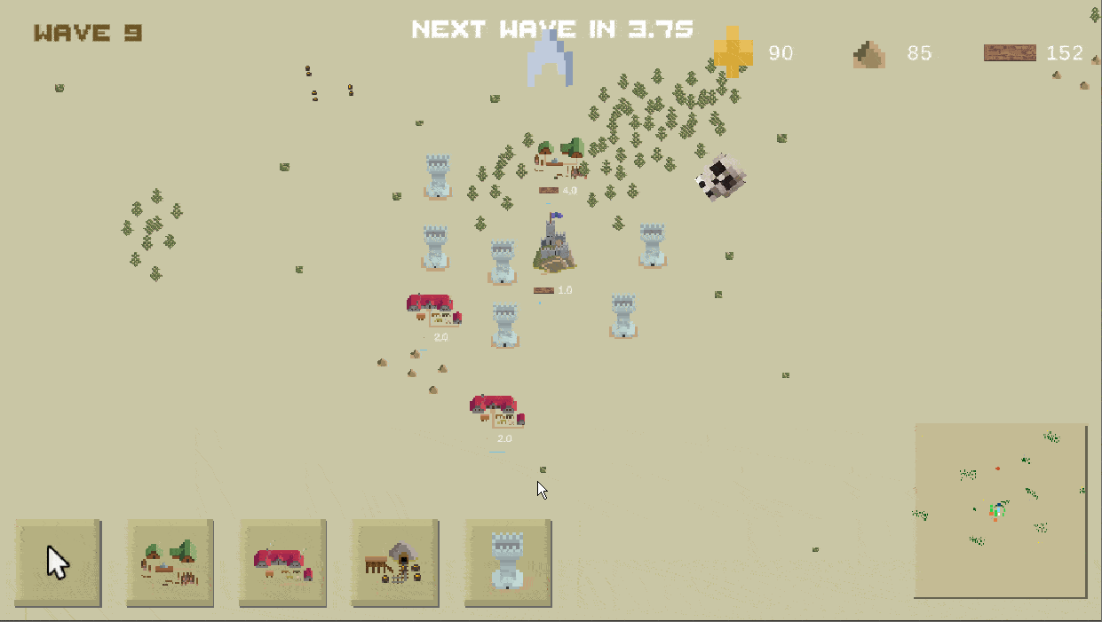 The game's objective is to survive from endless waves of undead enemies as long as possible. To deal with the increasing number of enemies, players must build buildings to harvest different resources on the map, then use these resources to build defense towers to defend the enemies and invest in more resources harvesting buildings to increase the speed of harvesting resources.